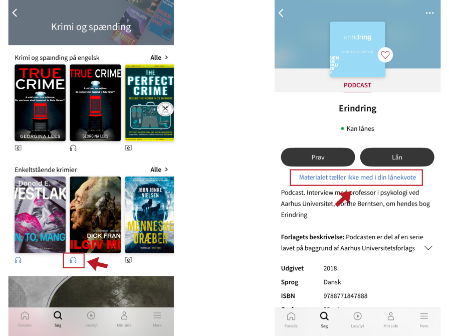 Når du browser i eReolens app, vil du altid kunne genkende de blå bøger på det blå ebogs-, lydbogs- eller podcast-ikon. Når du har valgt en bog, der er markeret med blåt, vil teksten "Materialet tæller ikke med i din lånekvote" være synlig under "Prøv" og "Lån"-knapperne.