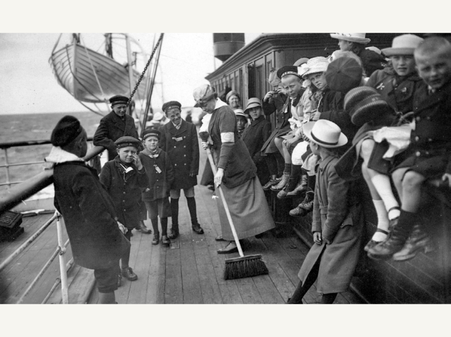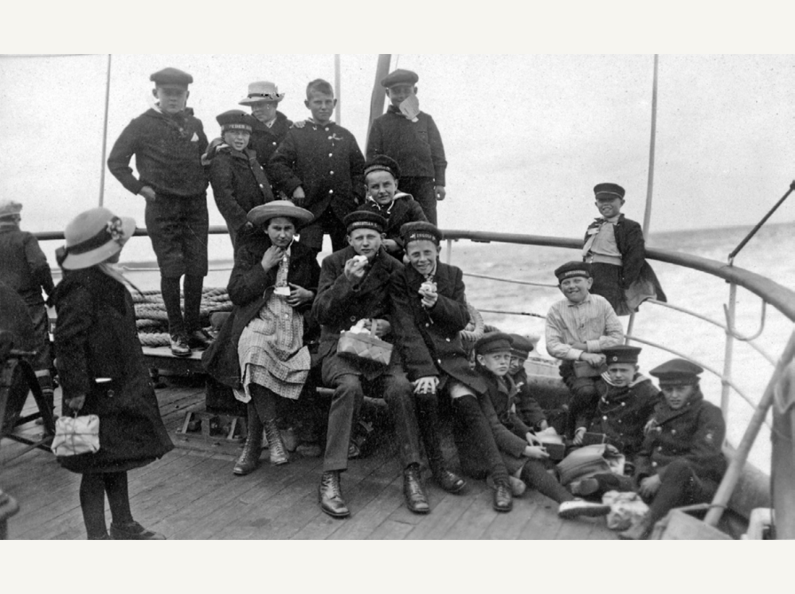 Børn ombord på damperen „Aegir“. Både da skibet ankom og sejlede afsted igen, stimlede folk sig sammen på havnen. Det var ikke ualmindeligt, at børn piskede stemningen op med flag og sange, så politiet måtte gribe ind.